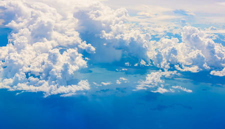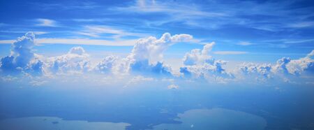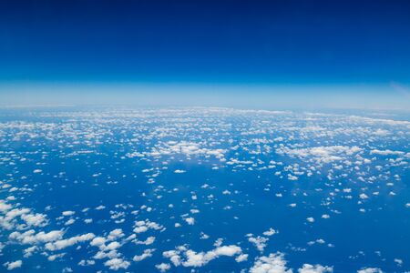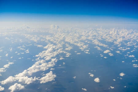 Blue sky. View from window of airplane flying in clouds. Skyscape cloudscape. Bird's eye.