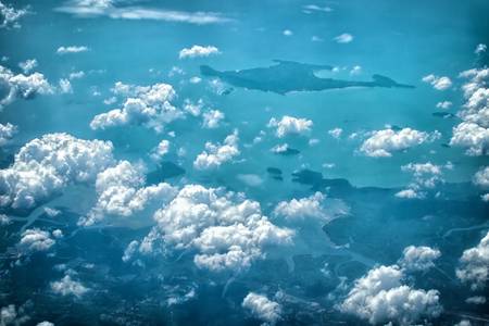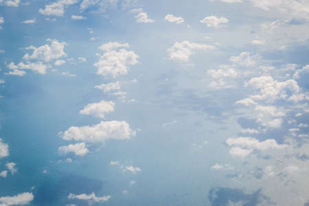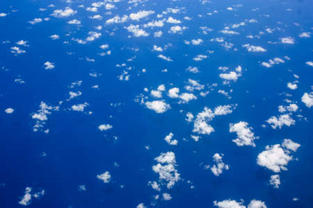 View of the cloudy sky from the airplane's window. Picture of the blue sky with white clouds. The foto that was made above the white cumulus. Picture of the white cumulus moving through the blue sky.