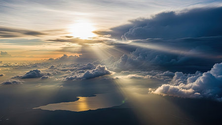 Beautiful landscape aerial view of Above The Clouds in the sky. The rays of the sun in the clouds.