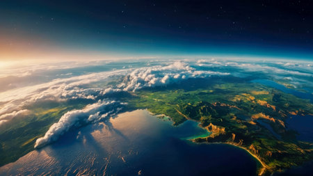 A high-altitude Earth view with ocean, green forests, and clouds. Sunlight illuminates the horizon, suggesting either sunrise or sunset.