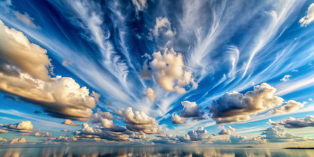 Serene and peaceful cloudy blue sky with soft, white, and wispy clouds scattered across the horizon, creating a sense of calmness and tranquility.