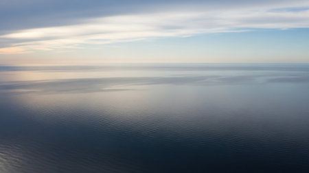 An expansive, tranquil ocean surface viewed from above, showing subtle ripples and soft reflections of the pale sky and distant clouds.