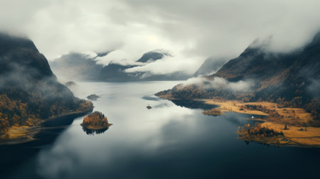 mountain lakes and mountains are captured in this drone photo, with heavy clouds adding to the atmospheric ambience. the style of erik johansson and carl holsoe is evident, reminiscent of traditional british landscapes. the use of light gray and amber tones creates a thought-provoking scene, akin to the work of philip mckay. ai generated