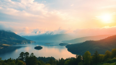 beautiful lake in misty morning forest and clouds are reflected in the calm water surface norwegian landscape with dark forest and lake among low clouds nature ecology eco tourism