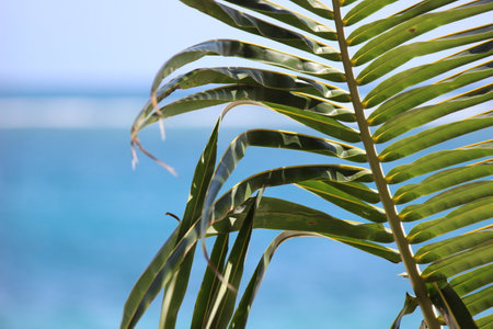 green palm leaf close up on background of the sea in the afternoon