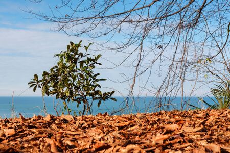 Colorful leaves carpet and the tree at the seaside