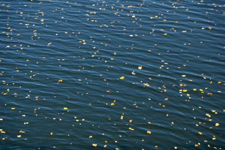 Autumn leaves floating on dark water create a serene and moody atmosphere. A tranquil scene of autumnal foliage on a dark, reflective water surface, evoking a sense of peace and seasons changing.