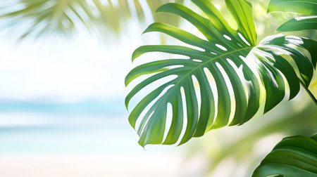 Vibrant Green Palm Leaf Close-Up with Sunny Ocean Beach Background. Concept of Tropical Nature, Summer Relaxation, Exotic Destination, Lush Foliage. Background, greeting card, Copy space.