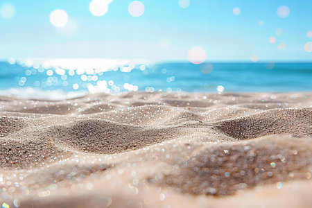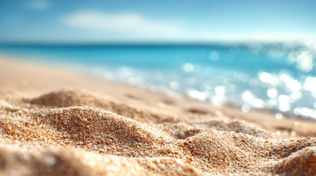 Sunlit beach sand with soft textures in the foreground and a vibrant blue ocean in the background, evoking the perfect summer getaway.