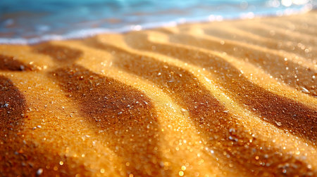 This close-up photograph captures the intricate texture of golden sand, highlighted with sparkling particles under soft natural light, offering a serene beach atmosphere.