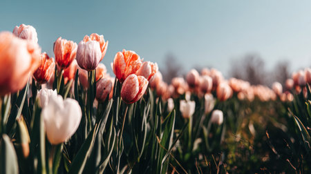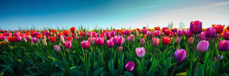 Vibrant spring background with a field of tulips, bright sunshine, and a clear sky.