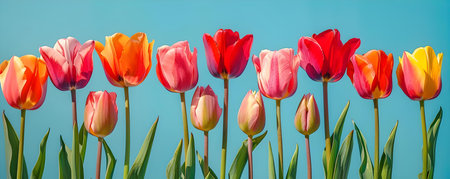 Tulips in Spring: A Bright and Colorful Display against a Clear Blue Sky. Concept Tulip Garden, Spring Blooms, Colorful Flowers, Clear Blue Sky, Nature Photography
