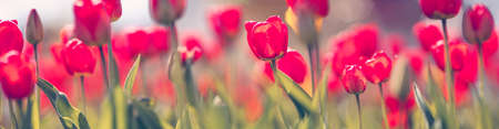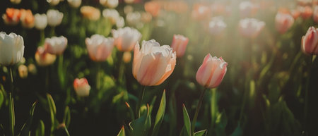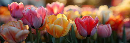 Colorful tulips basking in the golden sunset glow. captivating panoramic beauty.