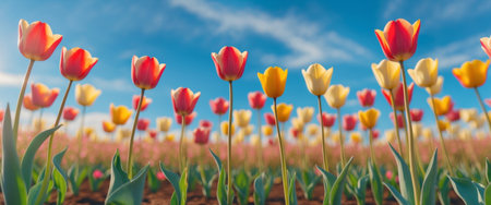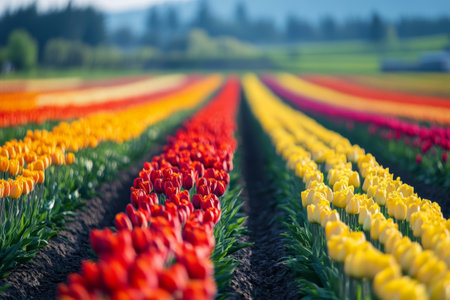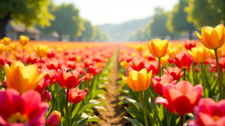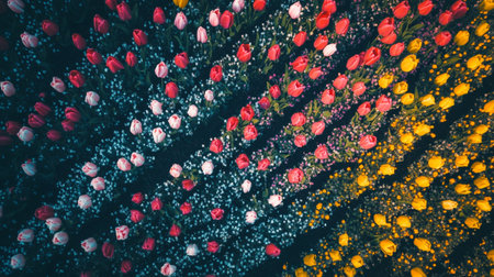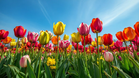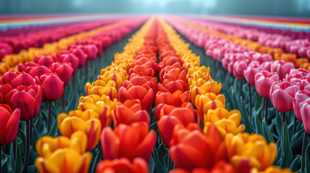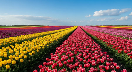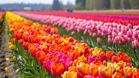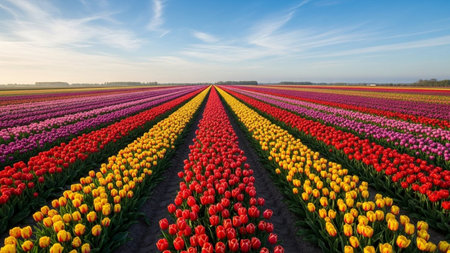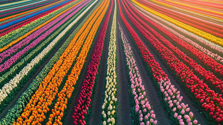 Colorful tulip fields bloom vibrantly in spring sunshine, creating beautiful patterns