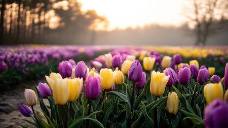 A breathtaking view of a vibrant tulip field at sunrise captures the beauty of nature with stunning purple and yellow flowers under the soft morning light.