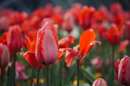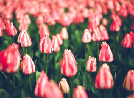 Close up of blooming flowerbeds of blossoming tulips during spring. Public flower garden, Netherlands.