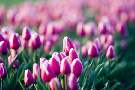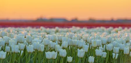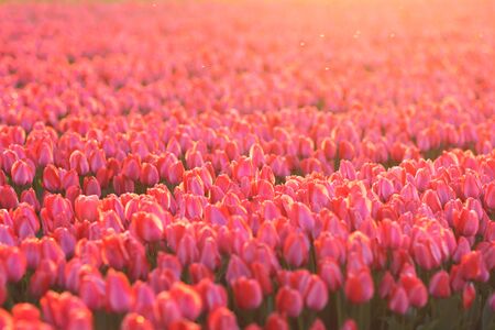 Tulips in an agricultural field in sunlight at sunrise in spring
