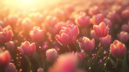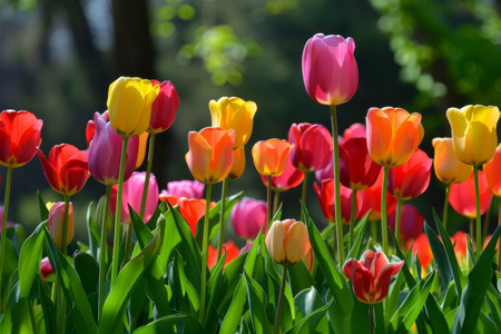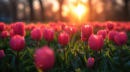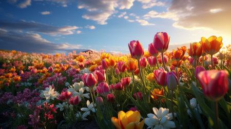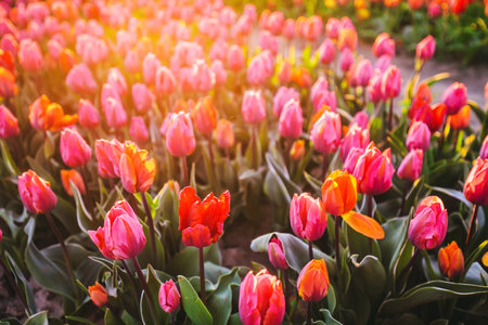 A stunning display of tulips in various colors basking in the warm glow of a spring sunset. This vibrant floral scene captures the essence of nature's beauty.