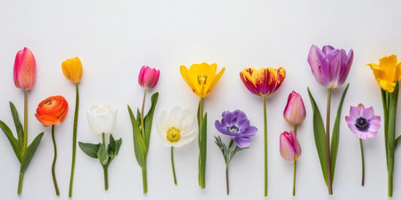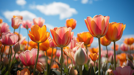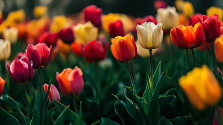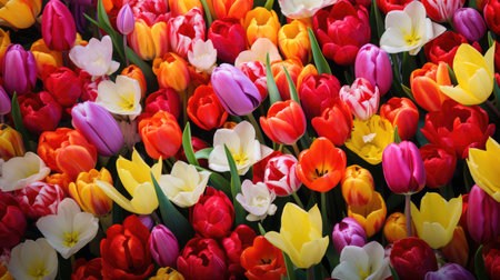 AI Generated. Vibrant Colorful Tulips Blooming Field Spring Flowers Garden