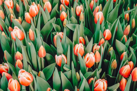 Vibrant field of blooming tulips in various shades of orange and pink, surrounded by lush green leaves, creating a stunning floral display that captures the essence of springtime beauty and nature