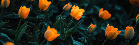 Close-up view of vibrant orange tulips in a dark field, showcasing the rich colors against a moody background. Nature and floral beauty concept.