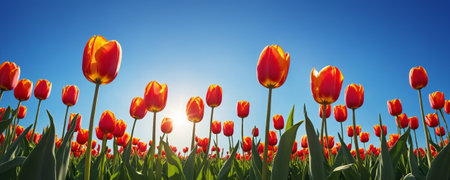 A vibrant field of blooming red tulips against a clear blue sky, showcasing the beauty of spring, color contrast, and nature s elegance in full bloom