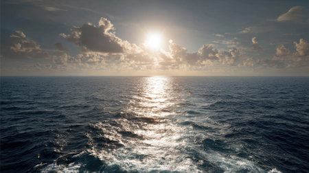Serene ocean view at sunset, showcasing sun reflecting on water surface, with clouds scattered across sky. tranquil scene evokes sense of peace and beauty