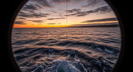 A serene sunset over the ocean viewed through a circular porthole, showing waves and a cloudy sky.