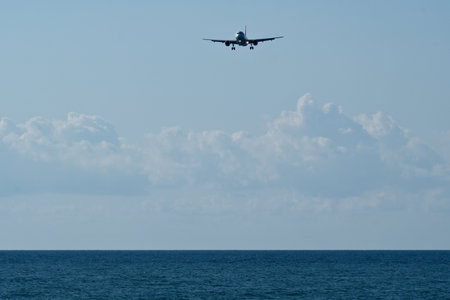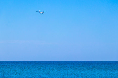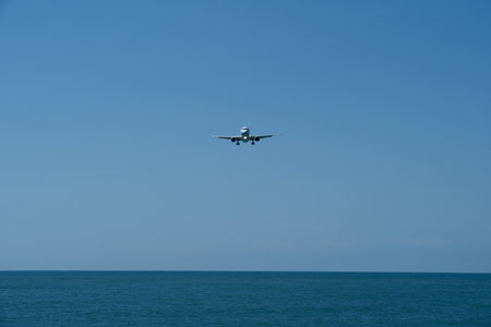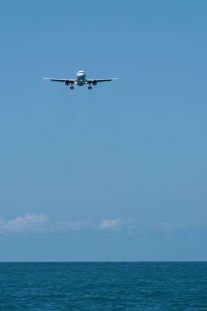 Passenger plane flying over the sea. Airplane flying over the sea in a sunny day with blue sky. Airplane landing at Airport. Travel concept.