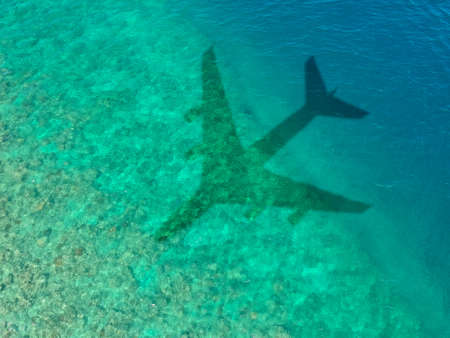 The concept of air travel. Top view of the ocean or sea, with the shadow of a flying plane. Copy space.