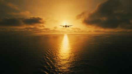 Airplane Approaching Over Calm Ocean at Dusk