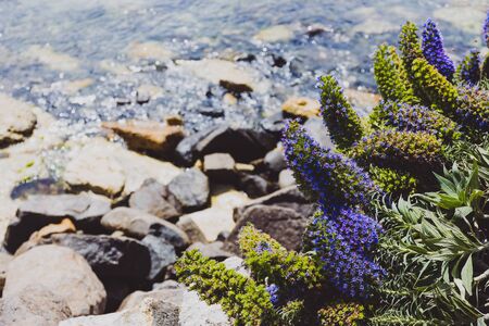 Incomparable beauty of flowers against the turquoise sea. Relaxing landscape for background. Selective focus-Vertical