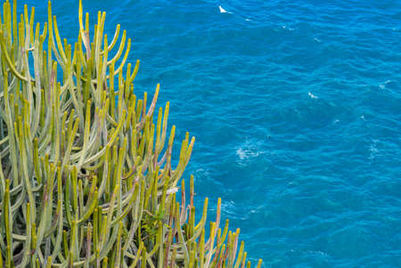 Large cactus with thorns growing on the cliff over the ocean. Sea with small waves on the background.