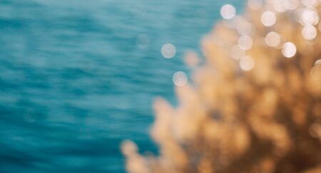 Green plants on the background of blurred turquoise sea, Cyprus