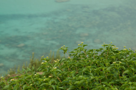 Green plant with broad leaves growing near a body of water with waves on a sunny day. Nature scene with blue sky. Outdoor peaceful seascape.