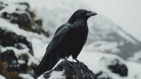 Majestic Black Raven Winter Mountain Perched Snow Rock Wildlife Photography bird dark cold beak eyes