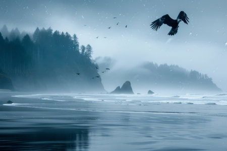 Eagles soar above a misty coastal landscape with waves gently lapping the shore, surrounded by towering trees and rocky cliffs.