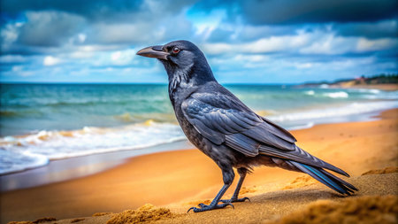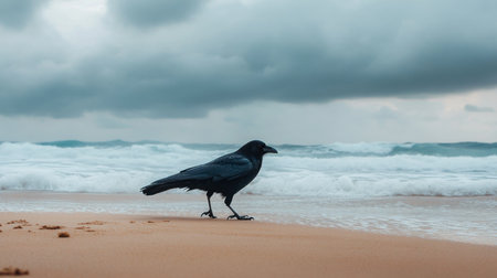 A striking black raven stands on a sandy beach, gazing at the rolling waves under a moody sky. The dramatic clouds create a captivating atmosphere for nature lovers.