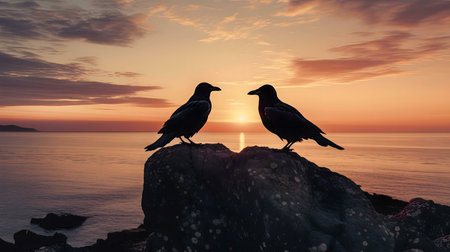 Two ravens perched on a rock at sunset overlooking the ocean.