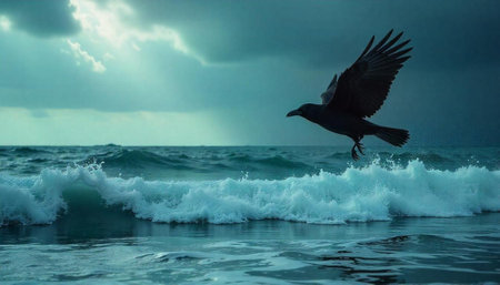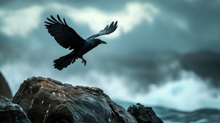 A striking black raven soars gracefully over a rugged rocky shoreline, captured in a moment of freedom amid dramatic waves and stormy skies.