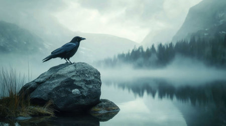 A majestic raven rests on a rock by a mist-covered lake, surrounded by mountains. The tranquil scene captures the essence of nature's solitude and serenity.