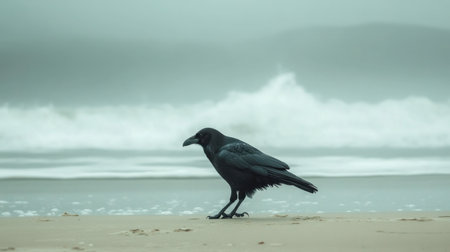 A solitary raven walks along a sandy beach, surrounded by fog and gentle waves. This serene coastal scene captures the beauty of nature and wildlife.