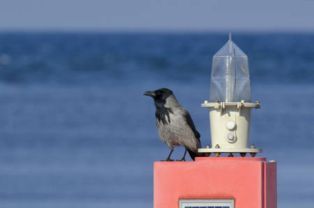 Hooded Crow standing on stone against the cloudy sky and with the sea background.