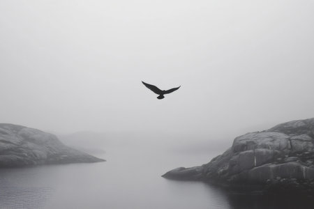 Black and white image of a bird soaring over a misty lake surrounded by a rocky coastline, creating a serene yet dramatic scene