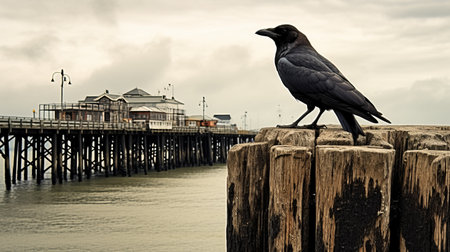a majestic bird perches on a wooden post by the ocean's edge, exuding a victorian goth style. the image captures the grandeur of scale and the gritty urban landscapes, reminiscent of edwin henry landseer's works. shot with the sony fe 85mm f/1.4 gm lens, the black and gray tones add to the overall aesthetic. ai generated