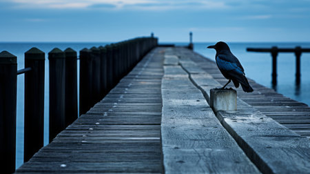 a bird perched on a concrete pier overlooking the water, captured in the artistic style of light indigo and dark black. this seaside scene, reminiscent of the works of jan van kessel the elder and jakub schikaneder, showcases the beauty of nature through the lens of the zeiss batis 18mm f2.8 lens. a stunning example of straight photography in a ravencore setting. ai generated