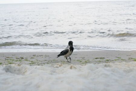 Beautiful crow on the sandy shore of the sea