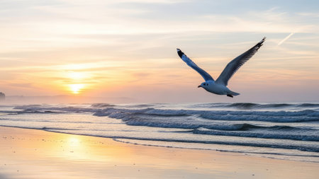 A stunning capture of a seagull soaring gracefully through a bright blue sky at sunset, with soft white clouds and warm golden light creating a peaceful ambiance.