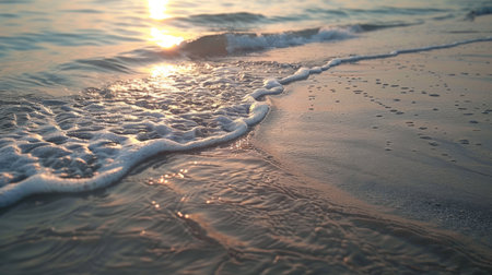Beautiful ocean waves gently rolling onto a sandy shore, creating a serene coastal scene perfect for relaxation and tranquility during golden hour.
