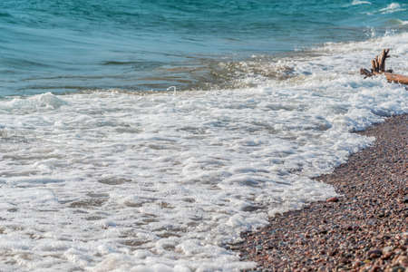 Close-up of a wave and white foam of seawater which is lying on the beach